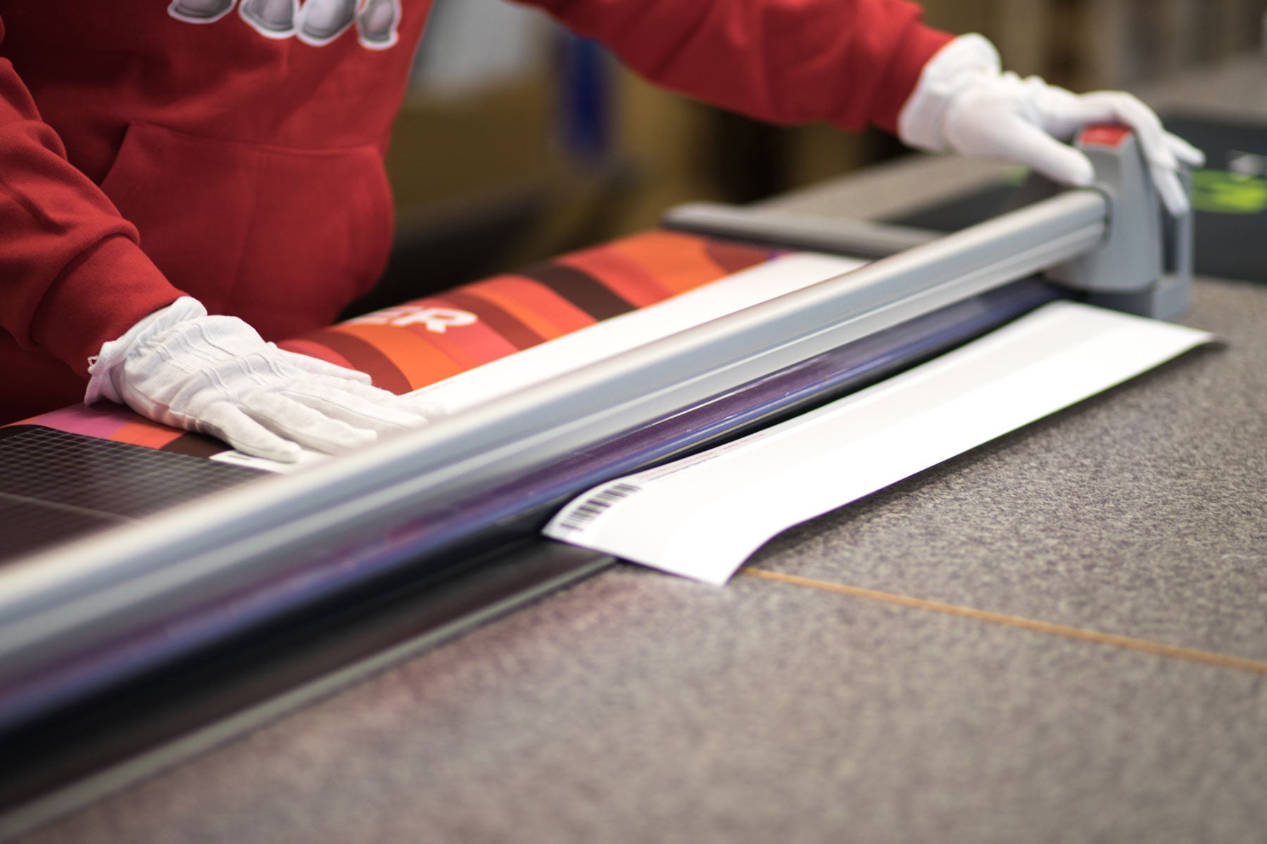 Une fois imprimée, les bords de l'affiche sont découpés avec soin.