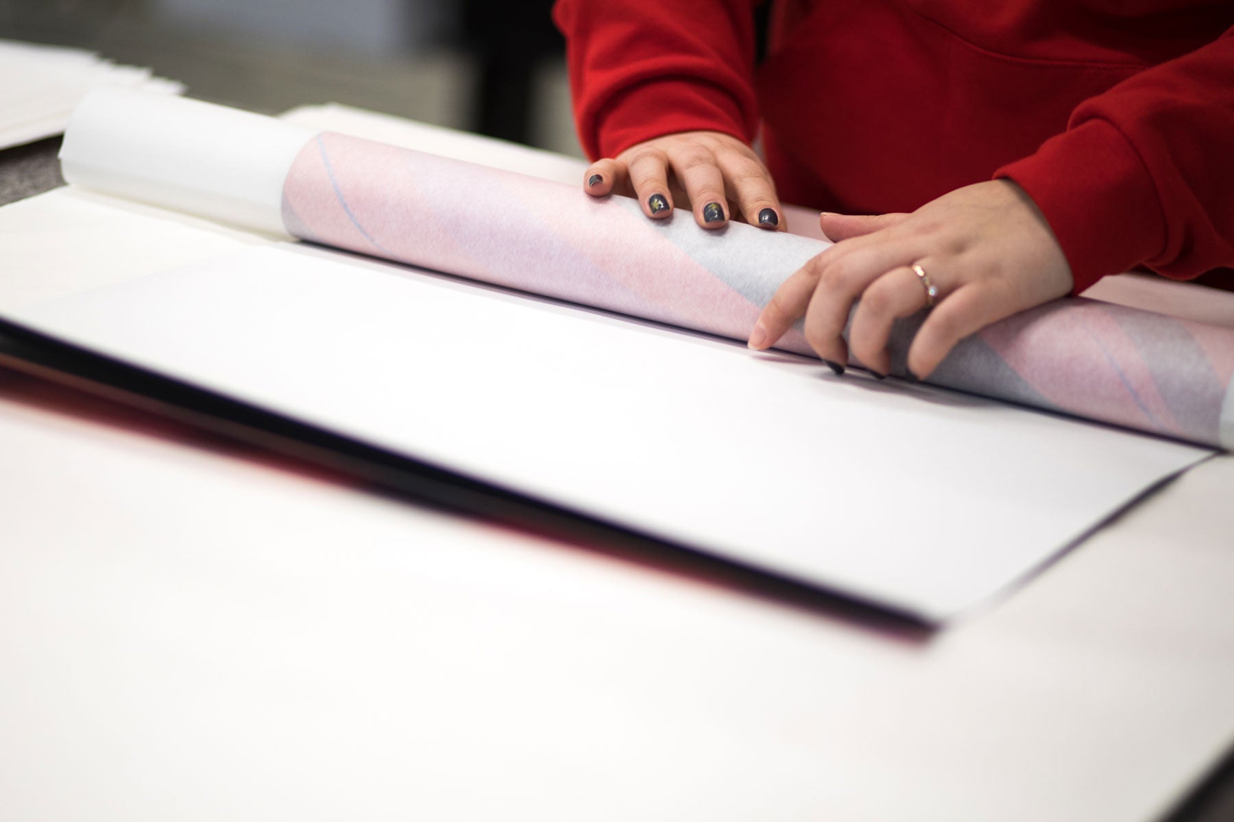 Les affiches sont soigneusement emballées dans du papier de soie pour assurer une protection maximale. Elles sont ensuite glissées dans un emballage carton triangulaire conçu pour résister aux aléas du transport, tout en permettant la suppression totale de tout composant en plastique.